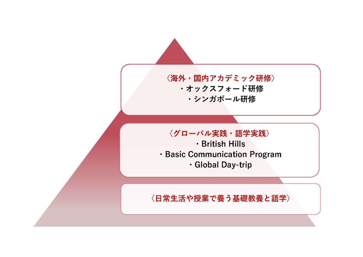 本校のグローバル教育は、授業内での全員学習からはじまり、積極的な生徒を対象とする国内外のアカデミックな研修へとステップアップしていけるプログラムになっています。