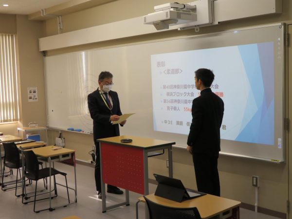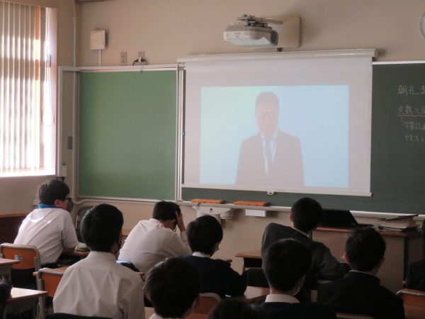 今回もLIVE配信を各教室で視聴する形で行いました。冒頭で特別の活躍した生徒達の表彰と紹介がありました。