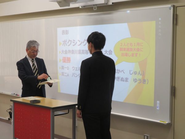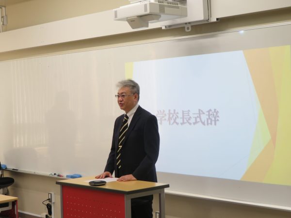 終業式では、受賞者の表彰、教務部長からの学事報告、生徒指導から講話の後、学校長から式辞がありました。