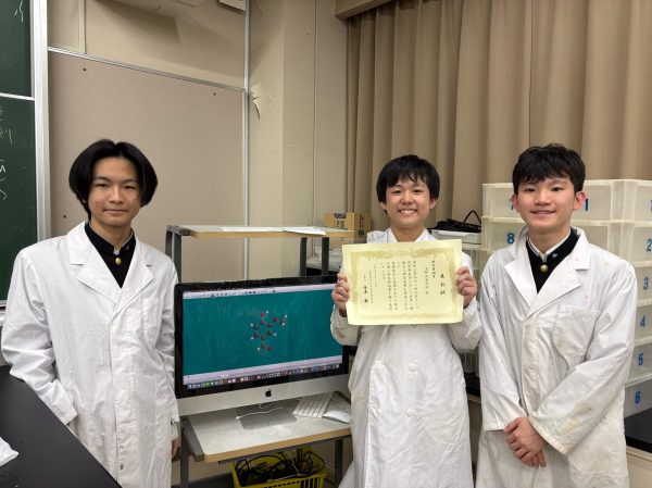 この研究発表会は昨年度末(2025年3月25日)に芝浦工業大学の豊洲キャンパスで行われた高校生向けのもので、本校化学部の宇治原君、名取君、剱持君のチームが研究奨励賞を受賞しました。